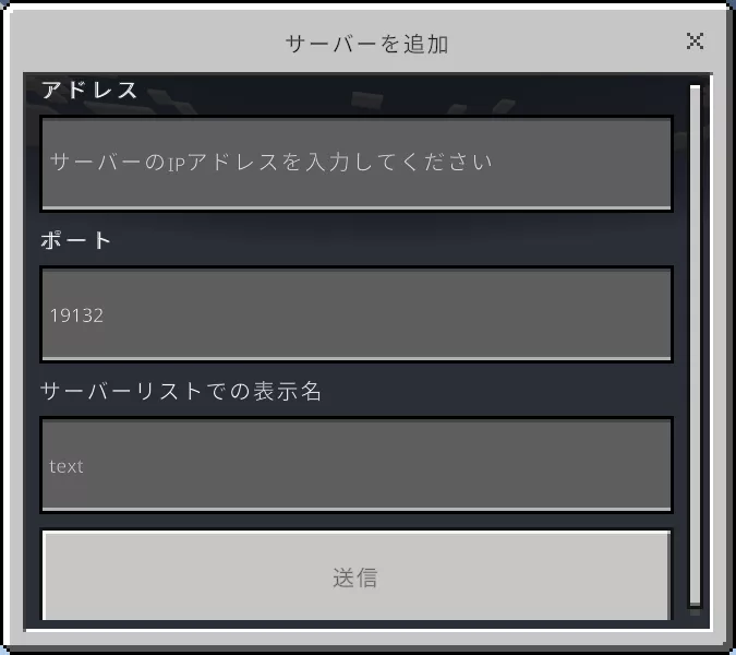 クリックすると画像のような画面が出てくると思いますので、参加したいサーバーのアドレス、ポートを入力してください。