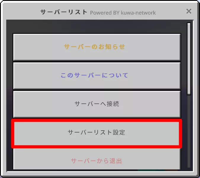 画像で囲まれているサーバーリスト絵の追加をONにするとサーバーリストにサーバーが追加されます。